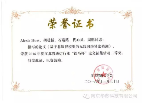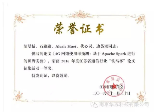 會議期間,評選出了2016年度江蘇省通信行業“鐵馬杯”論文征集活動的優秀科技論文,于此,華蘇科技 研發中心多名數據科學家憑借其獨到的觀點和優越的技術實力在“鐵馬杯”比賽中分別榮獲論文一等獎和二等獎各一篇,其中題名為“4G網絡使用率預測:基于Apache Spark進行的田野實驗”的論文榮獲一等獎,題名為“基于非監督模型的無線網絡異常檢測” 的論文榮獲二等獎。