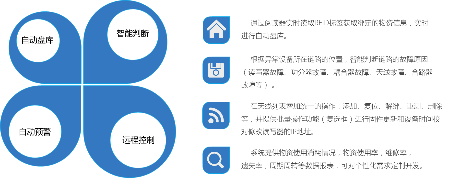 自動盤庫:通過RFID標簽信息讀取,自動識別和盤點室分資產,實現室分資產無人化盤點,提高資產盤點效率。