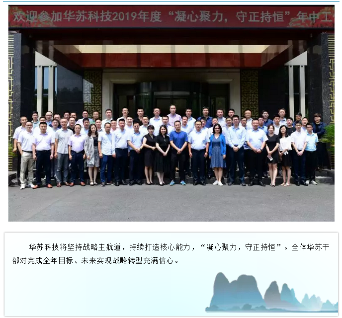 :2019年7月26日至27日,“華蘇科技2019年中工作會”在南京高淳圓滿召開。 華蘇科技將堅持戰略主航道,持續打造核心能力,“凝心聚力,守正持恒”。全體華蘇干部對完成全年目標、未來實現戰略轉型充滿信心。