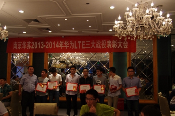 優異的成績離不開辛勤奮斗在一線的戰士們,為繼續發揚不怕吃苦、肯學肯干的精神,項目組特此在青奧會保障結束之際,舉行“南京華蘇2013~2014華為LTE三大戰役表彰大會",邀請公司領導前來慰問以及發表重要講話,表彰項目上的優秀新人以及優秀員工,宴請項目上所有的兄弟姐妹相聚在一起,以激勵員工再接再厲,再創佳績。最后本次大會也在大家的歡聲笑語中圓滿落下帷幕。