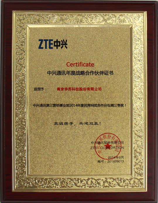 類公司十三家,南京華蘇科技股份有限公司參加了此次會議并再創佳績,喜獲2013-2014年度評估網優第五名的成績,同時也獲得中興通訊網優優秀合作方三等獎榮譽