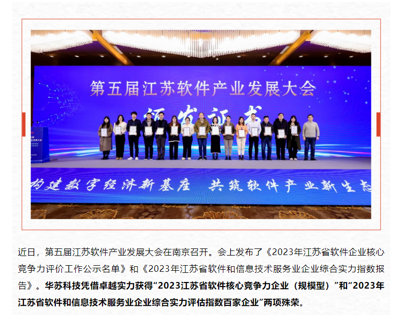 華蘇科技 憑借卓越實力獲得“2023江蘇省軟件核心競爭力企業(yè)(規(guī)模型)”