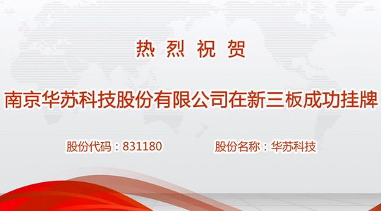 2014年10月14日, 南京華蘇科技股份有限公司迎來了她的里程碑意義的激動時刻——公司成功在全國中小企業股份轉讓系統(簡稱“新三板”)掛牌,股份名稱為“華蘇科技”,股份代碼為“831180 ”。
