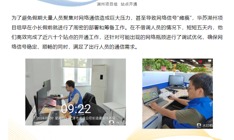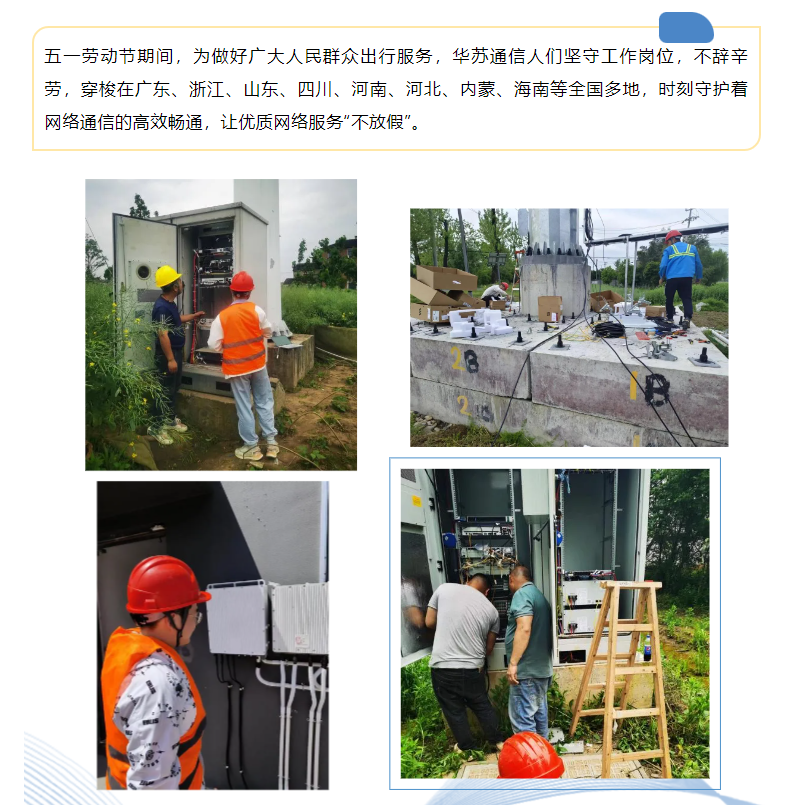 五一勞動節期間,為做好廣大人民群眾出行服務,華蘇通信人們堅守工作崗位,不辭辛勞,穿梭在廣東、浙江、山東、四川、