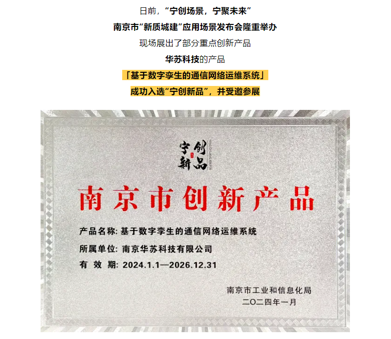 的產品「基于數字孿生的通信網絡運維系統」成功入選“寧創新品”,并受邀參展南京市“新質城建”應用場景發布會。
